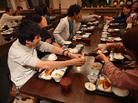 練習も終り、お楽しみの夕食。 天日干しのお米と美味しいおかず。 ちょっとだけビールで乾杯。